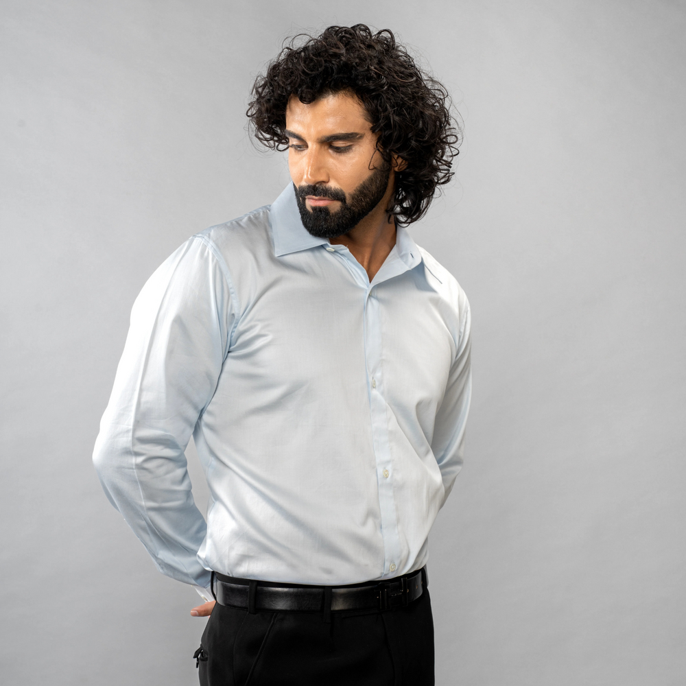 A pure Giza Cotton shirt featuring a spread collar and a single buttoned round cuff — polished, understated, and royal in bearing. Offering minimalist elegance with a commanding presence, this crisp formal shirt, tailored from pristine Giza Cotton and embellished with Trocas shell buttons adds depth, character, and natural grace to the bearer.