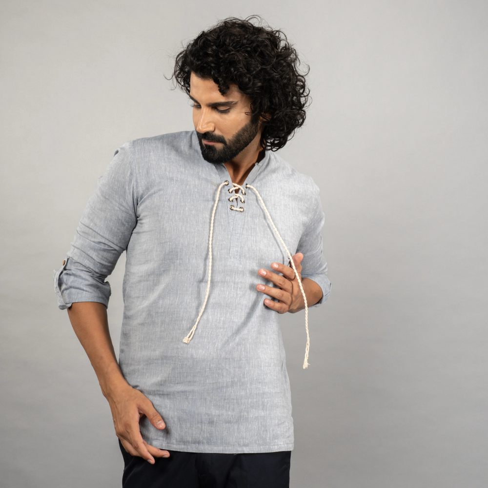 A maritime‑inspired lace‑up linen shirt with roll‑up sleeves, metal eyelets, and coconut shell button closures. Perfect for coastal escapes and waterfront evenings.