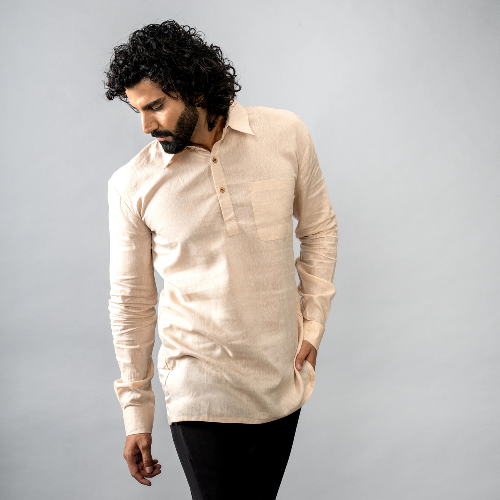 A casual‑luxury linen half‑placket shirt with coconut shell buttons and a relaxed fit — the perfect balance of laid‑back ease and tailored refinement.