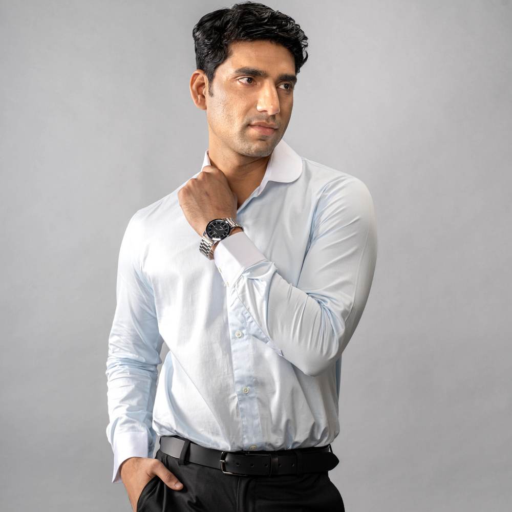 A formal standout with a contrast white club collar and cuffs, this Giza Cotton shirt blends legacy charm with modern precision. Trocas shell buttons add a tactile layer of refinement to an already distinguished silhouette. Refined structure meets old‑world charm.